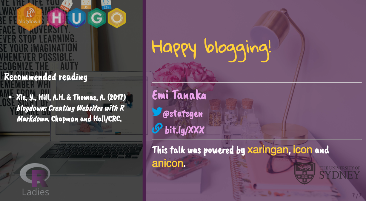 Yihui... I thought I was going to die... Thank you, I am so touched. You are so humble and uplifting. I like and use your work a lot and I was just working on my slides about blogdown. I'll try to do justice and live up to your praise!