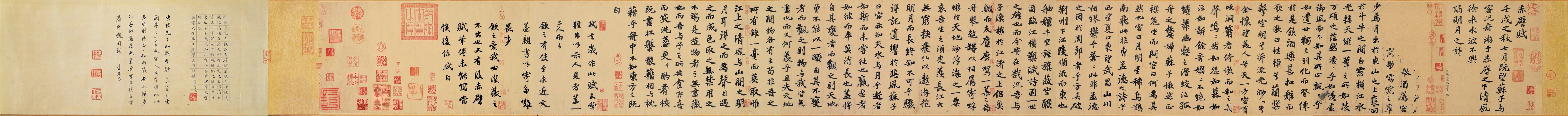 这是乌台诗案后写的。字比较内敛,前头三行坏了,后来被文徵明补写上。文谨慎地在后头写了个说明,将这事和苏舜钦补写怀素自叙帖的事并提,还提前罪了个己。文徵明的字本来比较飘逸,估计是为了配合苏轼后文的风格,收敛了不少锋芒。