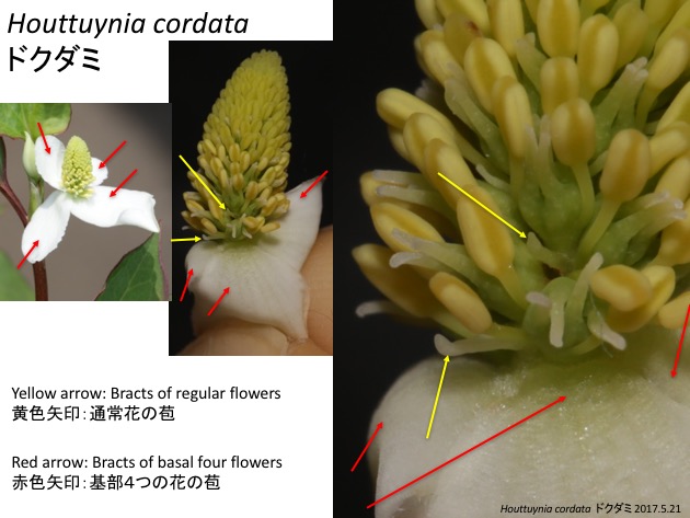 不用劳烦放大镜了,这是鱼腥草(Houttuynia cordata)的花(来源:「植物発生進化学」の講義録)。白色的看起来像花瓣的东西实际上是苞片(bract),算是叶子;上边黄色的是一簇退化的花的花药。它们整体组成一朵“花”的样子,所以叫伪花。